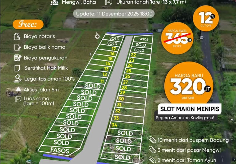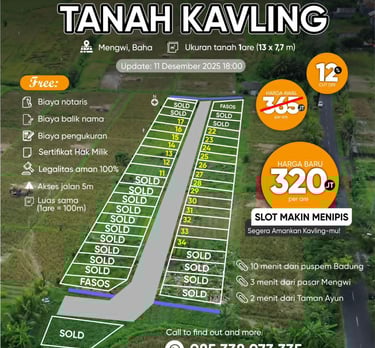 Kavling tanah strategis dekat Pura Taman Ayun, siap bangun dengan legalitas aman.
